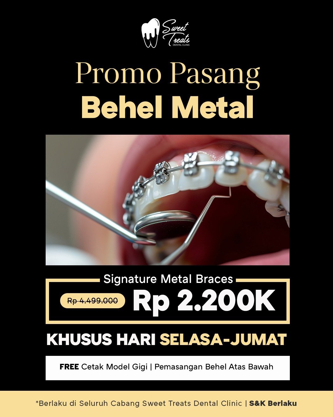 pemasangan behel metal di Sweet Treats Dental Clinic kini hanya Rp 2.200k, tersedia khusus hari Selasa Sampai Jumat.